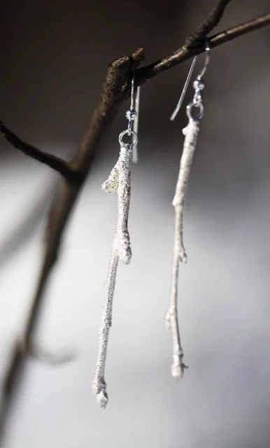 ”Processen går till så att jag tar en björkkvist och vaxar den. Oftast blir det just björk, eftersom vi alla har ett förhållande till det trädet. Men det kan också vara rönn eller asp. Eller fröställningar till olika blommor. Sedan fäster jag alkottarna på stammen i olika variationer. Därefter trär jag en cylinder över alltsammans och fyller den med gips. Nästa steg är att bränna bort det ursprungliga materialet i en brännugn. Det är en traditionell metod som kallas Förlorad vaxform. Nu har jag alltså skapat en gjutform som går att fylla med flytande silver.