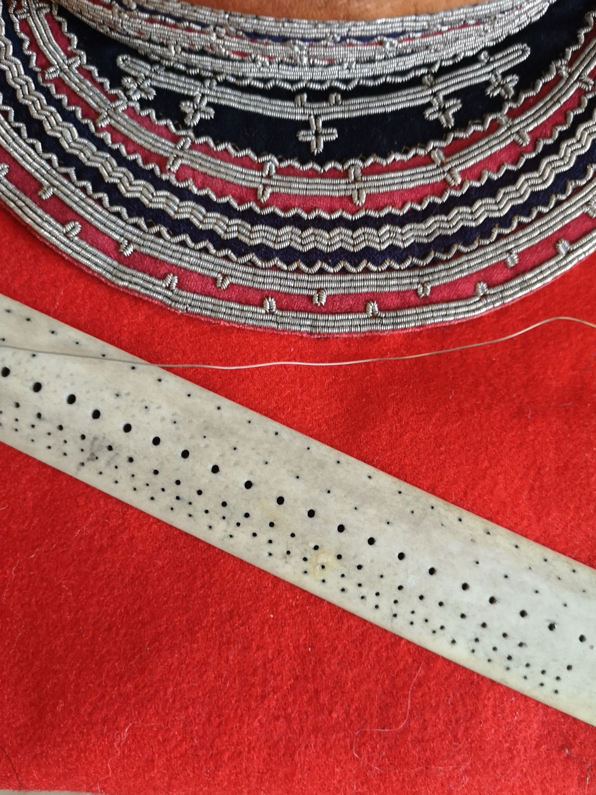 Efter maten visar Svea sina arbetsredskap och en del slöjdföremål: barmkläden, armband, bälten och skinnväskor i eget garvat skinn, dekorerade med tenntrådsbroderier. Tenntråden kom förr i form av grova stänger och hon demonstrerar hornskivan hon använt för att skala ned dem. Tekniken var att dra tråden genom skivan i allt mindre och mindre hål. De minste skapade hon genom en synål och är nästan inte synliga för ögat!